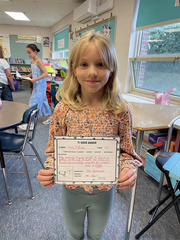 This week Holly DiBona was recognized by her teacher, Mrs. Jankowski, for her determination in working through some challenging math problems. In doing so, she demonstrated what it means to be the G = Growth as a Swallow Union Ti-GRRR! Way to go Holly and remember that anything worth anything takes effort and hard work!